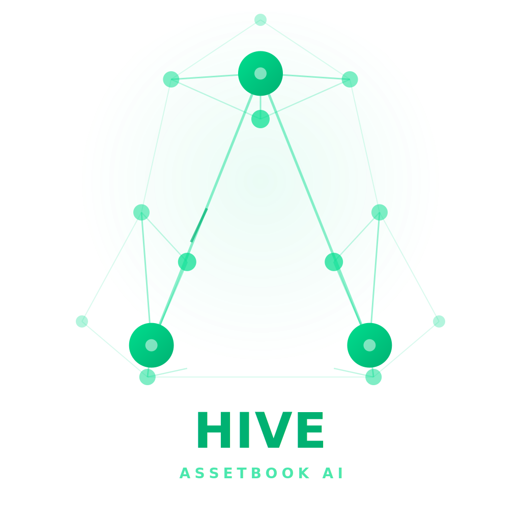 Hivemind network icon with "HIVE" and "ASSETBOOK AI" wordmark